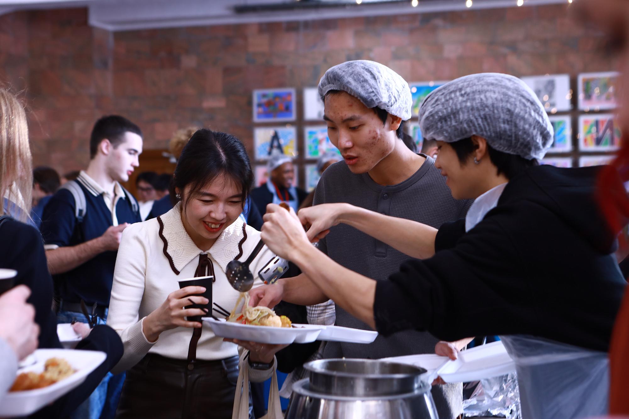 Next was the Asian part of the journey. First-year students from China surprised guests with a mix of spicy shrimp, glass noodles, Beijing cabbage, and thread-like enoki mushrooms. A team led by student Zhang Ruijie served chicken wings marinated in cola. It is worth noting that this bold combination of ingredients is quite popular among youth in China. The original treat was such a hit with guests that the wings were literally swept off the table.