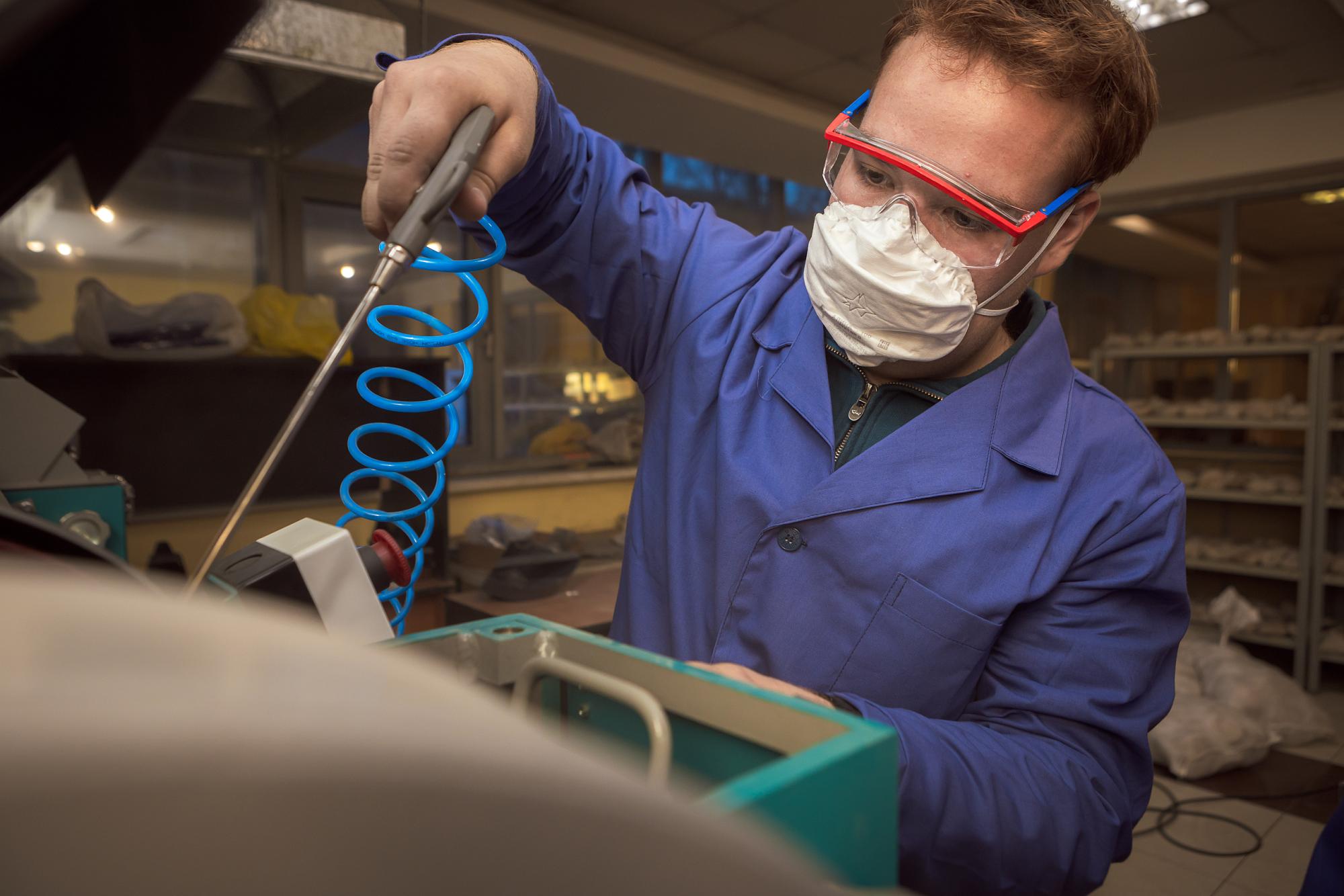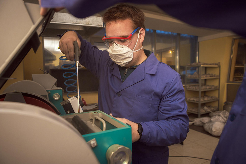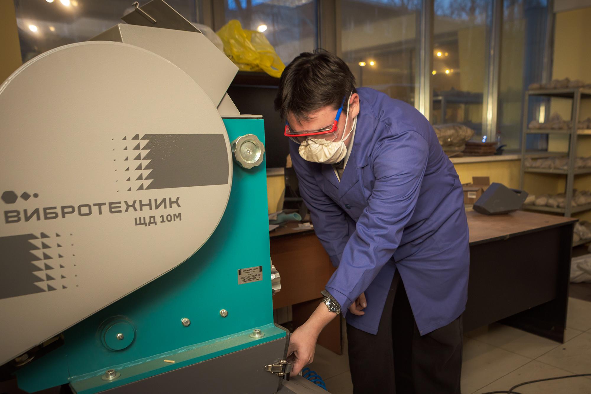 One of the students working in the new workshop is future geophysicist Saveliy Masarnovskiy. He prepares samples delivered from gold exploration expeditions.