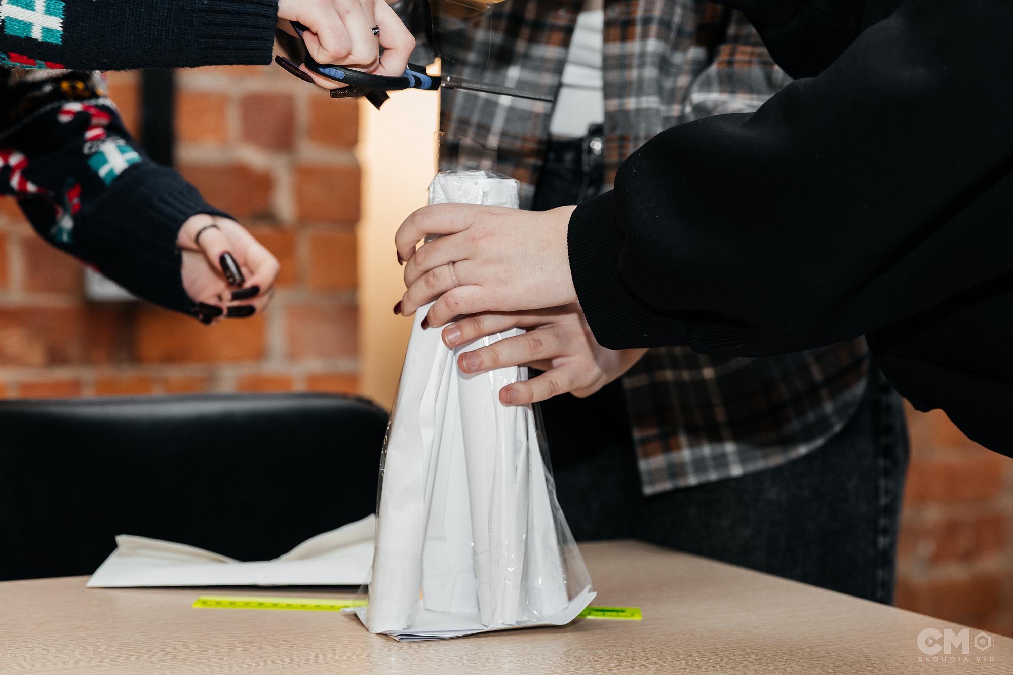 The “Chemist's” station tasked students with finding a component to create artificial snow. Intriguingly, this required some real chemistry work. The teams had to treat pieces of paper with an iodine solution to reveal letters written in invisible ink, and then assemble these letters to form a complete magic word.