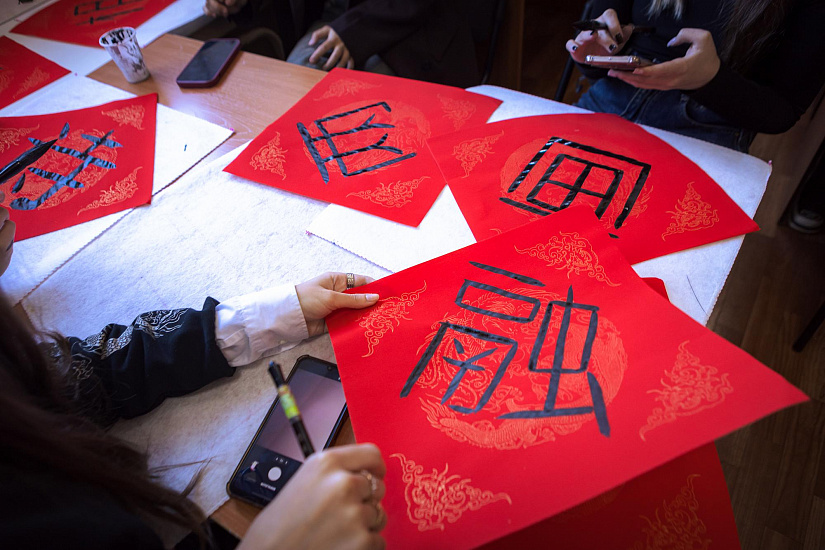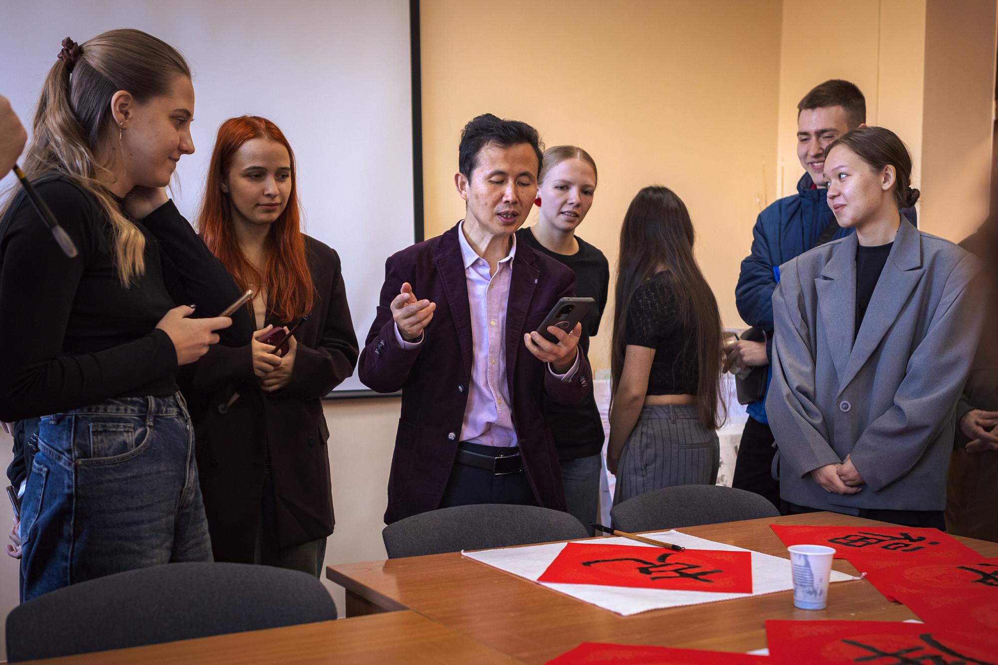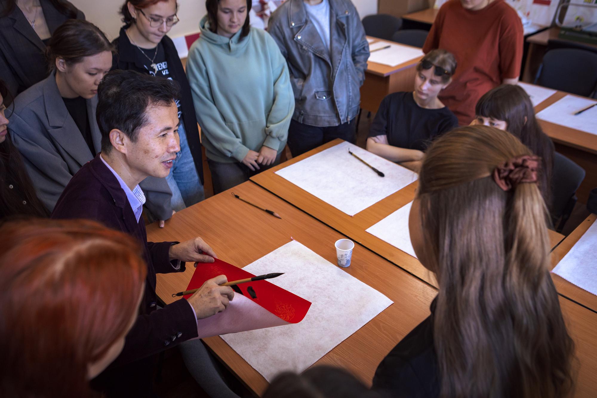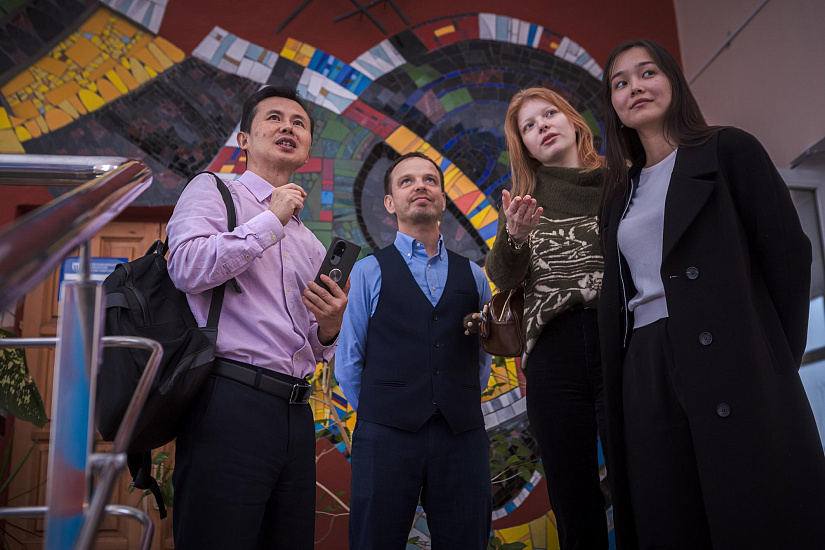Jiang Hongsheng also introduced the culture of his country to future architects. The artist asked the students to write out characters from a lyrical poem about young women. As he demonstrated the strict order and sequence of the brushstrokes, the master spoke about the symbolism inherent in the art of Chinese calligraphy. According to him, it takes 30-40 years to perfect one's calligraphy skills. The characters can reveal much about Chinese culture and worldview. For example, "Fu" 福 translates as "happiness." This character is composed of several radicals signifying 'mouth,' 'field,' and 'roof.' If you combine these three elements, it implies that someone who is well-fed, clothed, and has a home is already a happy person. Furthermore, the professor took a tour of the main building of INRTU, which is adorned with mosaics, stained-glass windows, and other monumental artworks created by the university's graduates. The tour was led by Dmitry Dorokhin, Department of Monumental and Decorative Art and Design named after V.G. Smagin.