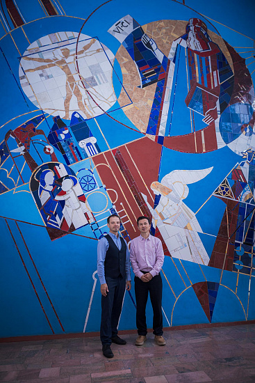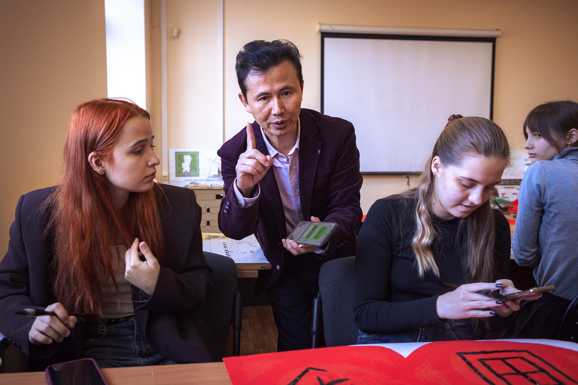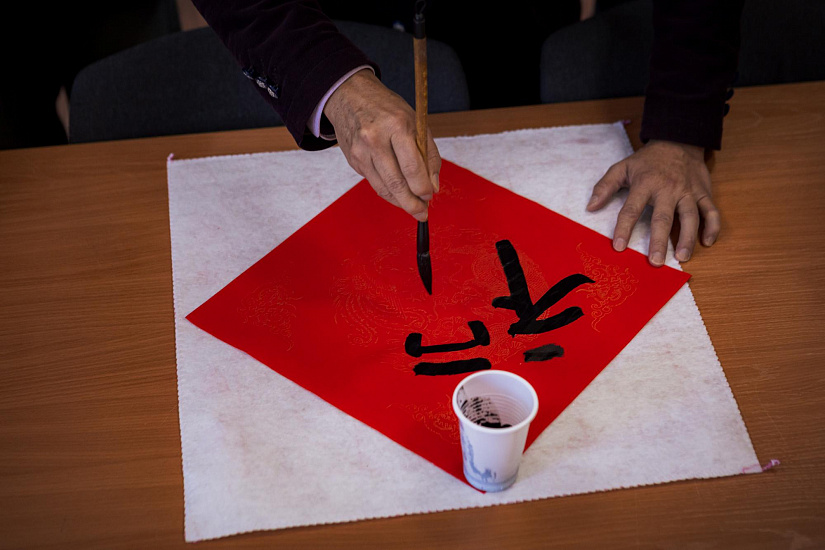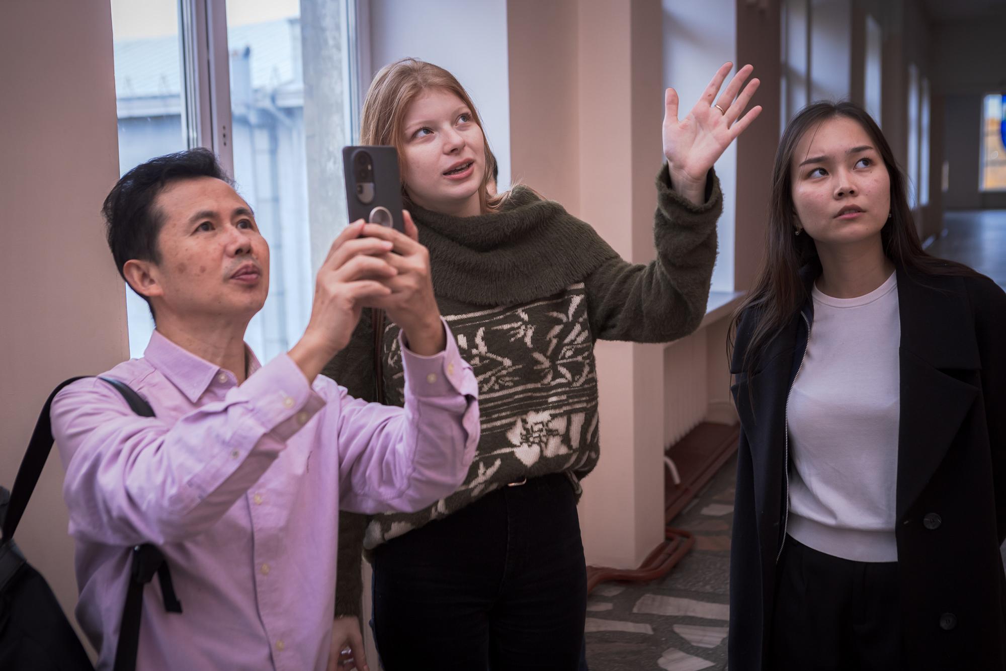 Jiang Hongsheng also introduced the culture of his country to future architects. The artist asked the students to write out characters from a lyrical poem about young women. As he demonstrated the strict order and sequence of the brushstrokes, the master spoke about the symbolism inherent in the art of Chinese calligraphy. According to him, it takes 30-40 years to perfect one's calligraphy skills. The characters can reveal much about Chinese culture and worldview. For example, "Fu" 福 translates as "happiness." This character is composed of several radicals signifying 'mouth,' 'field,' and 'roof.' If you combine these three elements, it implies that someone who is well-fed, clothed, and has a home is already a happy person. Furthermore, the professor took a tour of the main building of INRTU, which is adorned with mosaics, stained-glass windows, and other monumental artworks created by the university's graduates. The tour was led by Dmitry Dorokhin, Department of Monumental and Decorative Art and Design named after V.G. Smagin.